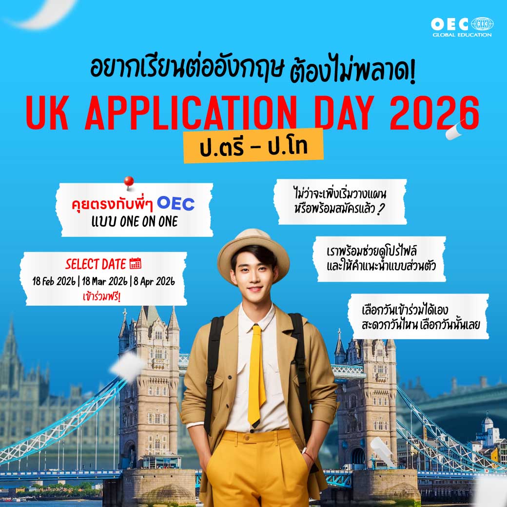 การศึกษาต่อในอังกฤษ ยังคงเป็นอีกหนึ่งความใฝ่ฝันของนักเรียนทั่วโลก ด้วยชื่อเสียงของมหาวิทยาลัยชั้นนำ หลักสูตรที่หลากหลาย และโอกาสในการพัฒนาตนเองอย่างรอบด้าน หากคุณกำลังมองหาโอกาสในการเรียนต่อระดับปริญญาตรีหรือปริญญาโทในปี 2026 ประเทศอังกฤษคือตัวเลือกที่น่าสนใจอย่างยิ่ง OEC Global Education พร้อมเป็นผู้ช่วยในการสานฝันของคุณให้เป็นจริง