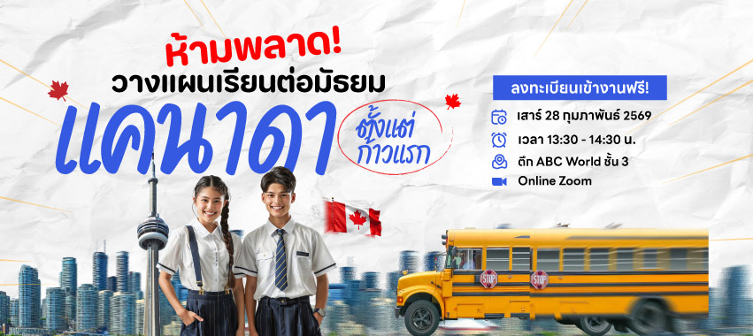28 ก.พ. 2569 >> สัมมนาวางแผนเรียนต่อมัธยมแคนาดา 2026 เจาะลึกเจาะลึก Roadmap สู่ความสำเร็จตั้งแต่ก้าวแรก