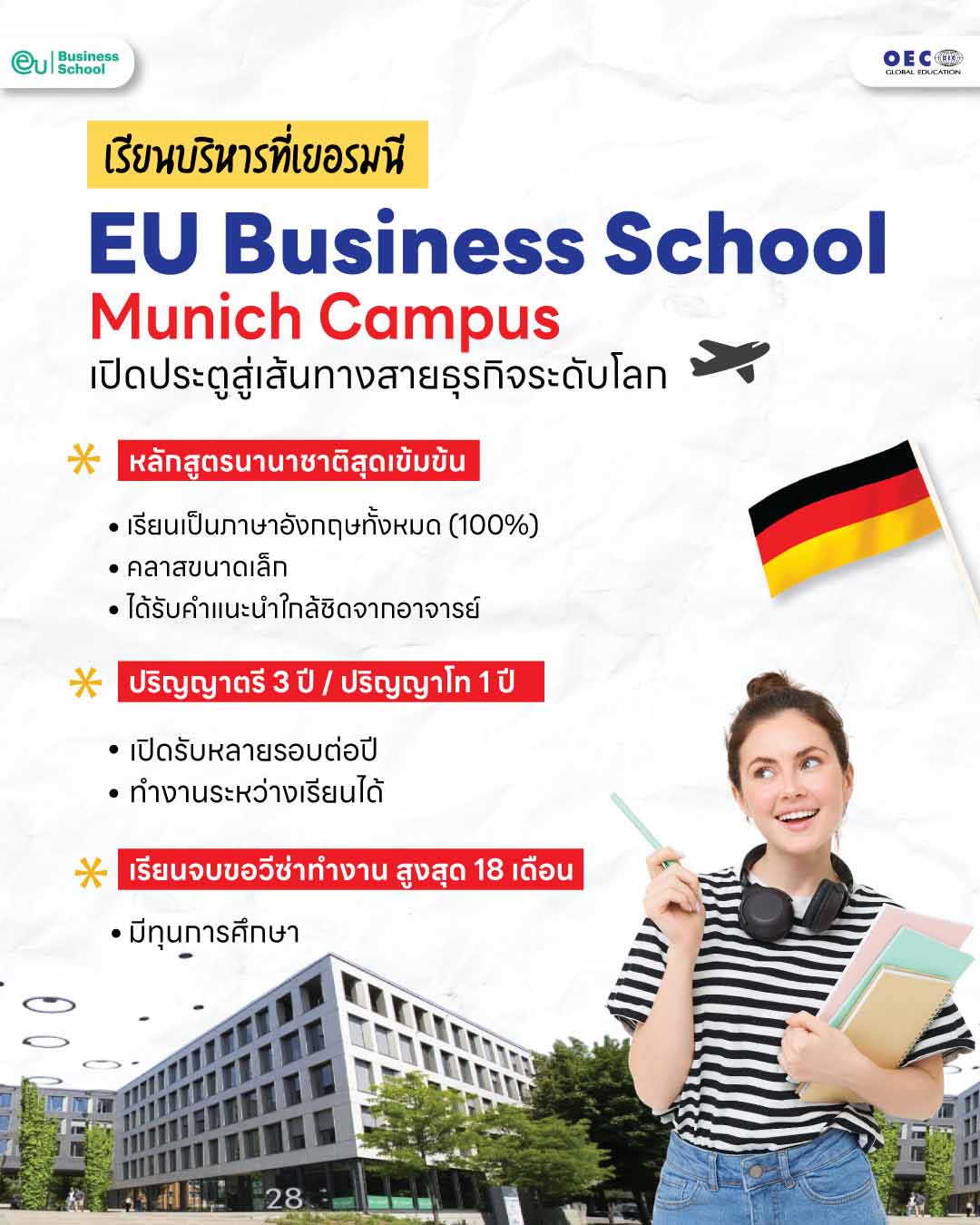เรียนต่อ ป.ตรี-โท กับ EU Business School ประเทศเยอรมนี สวิตเซอร์แลนด์ สเปน เน้นการเรียนการสอนทางด้านธุรกิจ โดยเป็นหลักสูตรภาษาอังกฤษ เพื่อเตรียมความพร้อมนักศึกษาสู่การเป็นนักธุรกิจนานาชาติ