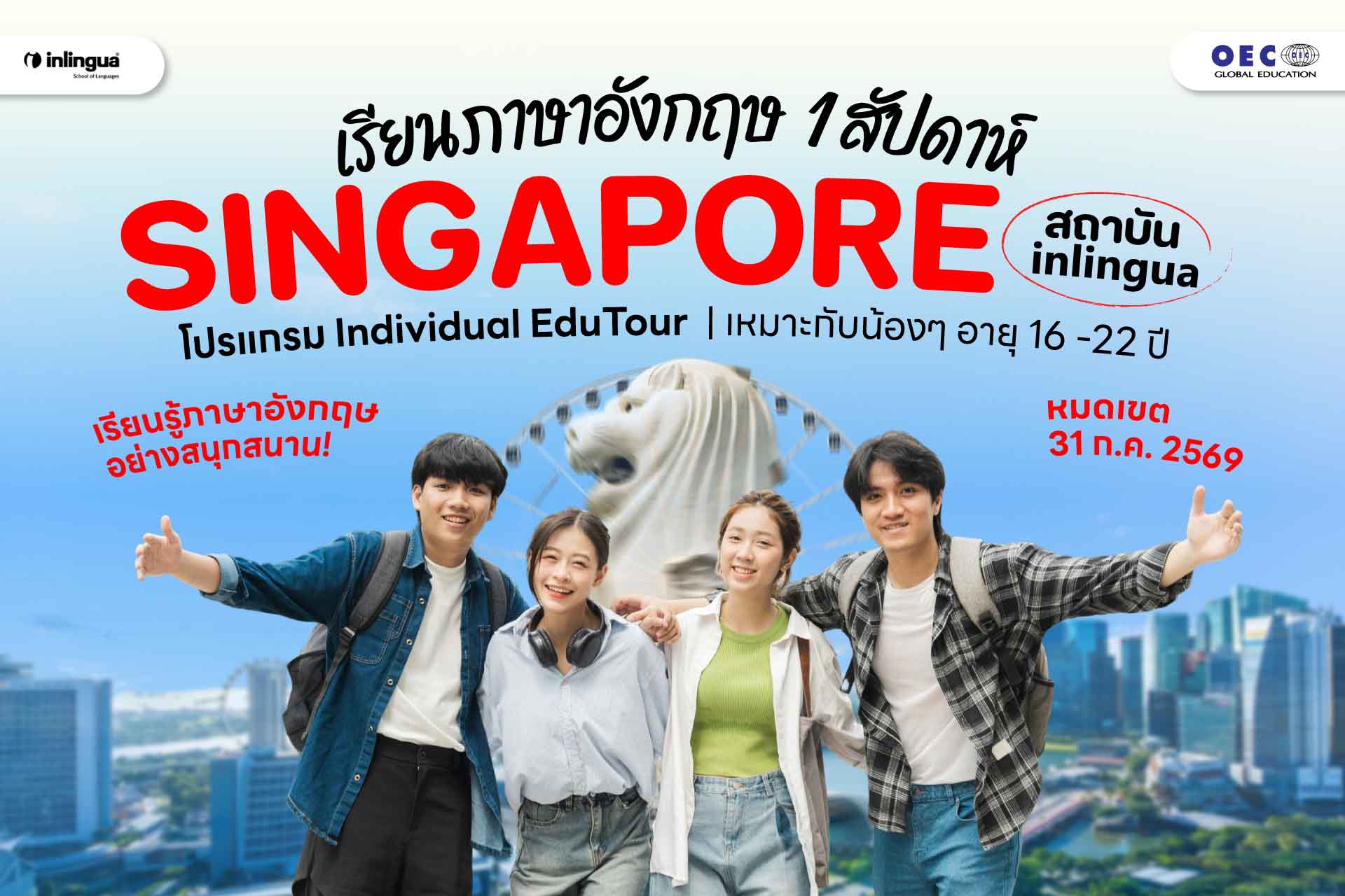 OEC Global Education ขอแนะนำโปรแกรม Individual EduTour จากสถาบัน inlingua School of Languages ประเทศสิงคโปร์ โปรแกรมคุณภาพที่ออกแบบมาเพื่อให้น้อง ๆ ได้เรียนรู้ภาษาอังกฤษอย่างสนุกสนาน พร้อมเปิดโลกทัศน์ใหม่ในระดับสากล