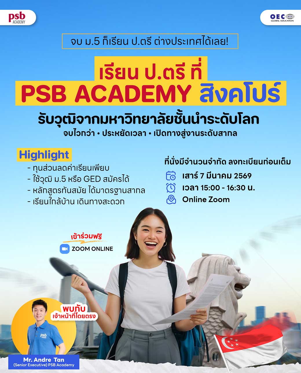 มาคว้าปริญญาตรีจากมหาวิทยาลัยชื่อดังระดับโลกได้ในเวลาที่เร็วกว่า และเริ่มต้นชีวิตการทำงานในระดับสากลได้ทันที! OEC Global Education ขอเชิญน้องๆ มาร่วมสัมมนา Onsite สุดพิเศษ เจาะลึกเส้นทางการเรียนต่อปริญญาตรีที่สถาบันชั้นนำของสิงคโปร์อย่าง PSB Academy ที่จะเปลี่ยนอนาคตของคุณให้ก้าวไกลกว่าเดิม