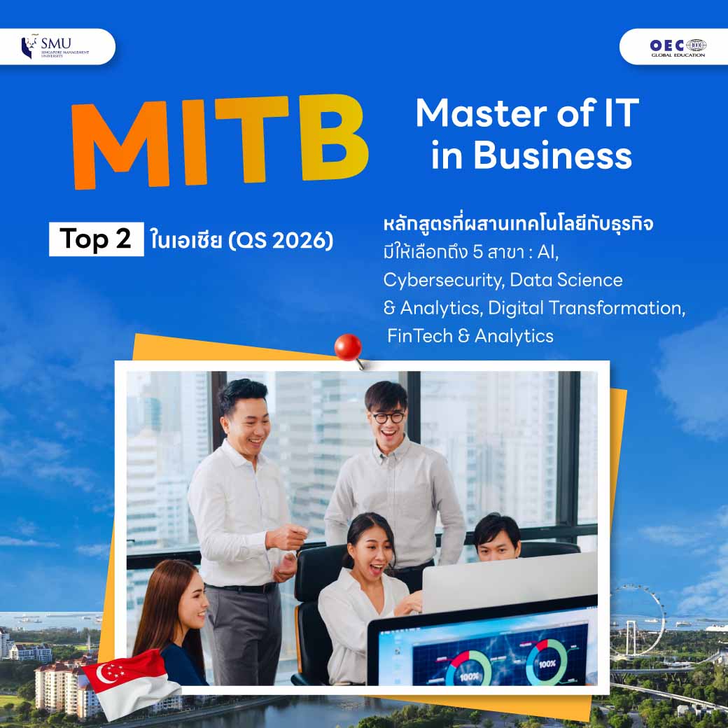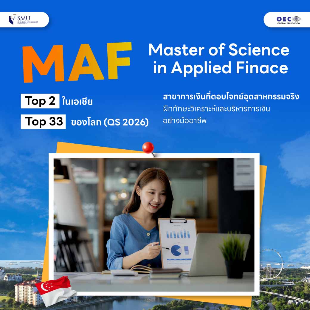 สิงคโปร์ คือศูนย์กลางทางธุรกิจและการเงินชั้นนำของเอเชีย และ Singapore Management University (SMU) ก็คือหนึ่งในมหาวิทยาลัยหัวใจสำคัญที่ผลิตบุคลากรคุณภาพระดับโลก OEC Global Education ขอพาทุกท่านไปเจาะลึก 5 หลักสูตรปริญญาโทตัวท็อปจาก SMU ที่ได้รับการจัดอันดับให้อยู่ในระดับ "Top 5 ของเอเชีย" อย่างต่อเนื่อง