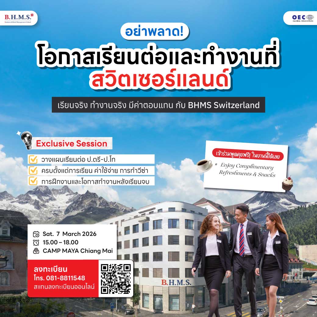 7 มี.ค. 2569 >> เรียนต่อและทำงานที่สวิตเซอร์แลนด์ เรียนจริง ทำงานจริง มีค่าตอบแทน กับ BHMS Switzerland @CAMP MAYA Chiang Mai