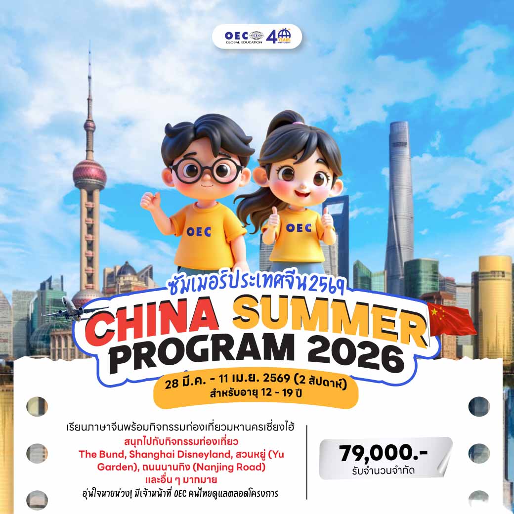 สัมผัสประสบการณ์สุดพิเศษที่ผสมผสานกลิ่นอายวัฒนธรรมตะวันตกและตะวันออกอันมีเสน่ห์ OEC Global Education ขอเชิญชวนน้องๆ ร่วมเดินทางสู่เซี่ยงไฮ้ในโปรแกรมซัมเมอร์ 2 สัปดาห์เต็ม ที่จะได้เรียนกับอาจารย์เจ้าของภาษา พัฒนาทักษะฟัง พูด อ่าน เขียน อย่างมั่นใจ พร้อมร่วมกิจกรรมวัฒนธรรมจีนหลากหลาย ทั้งการเขียนพู่กันจีน ทำอาหารจีน และการทัศนศึกษาในเมืองเซี่ยงไฮ้