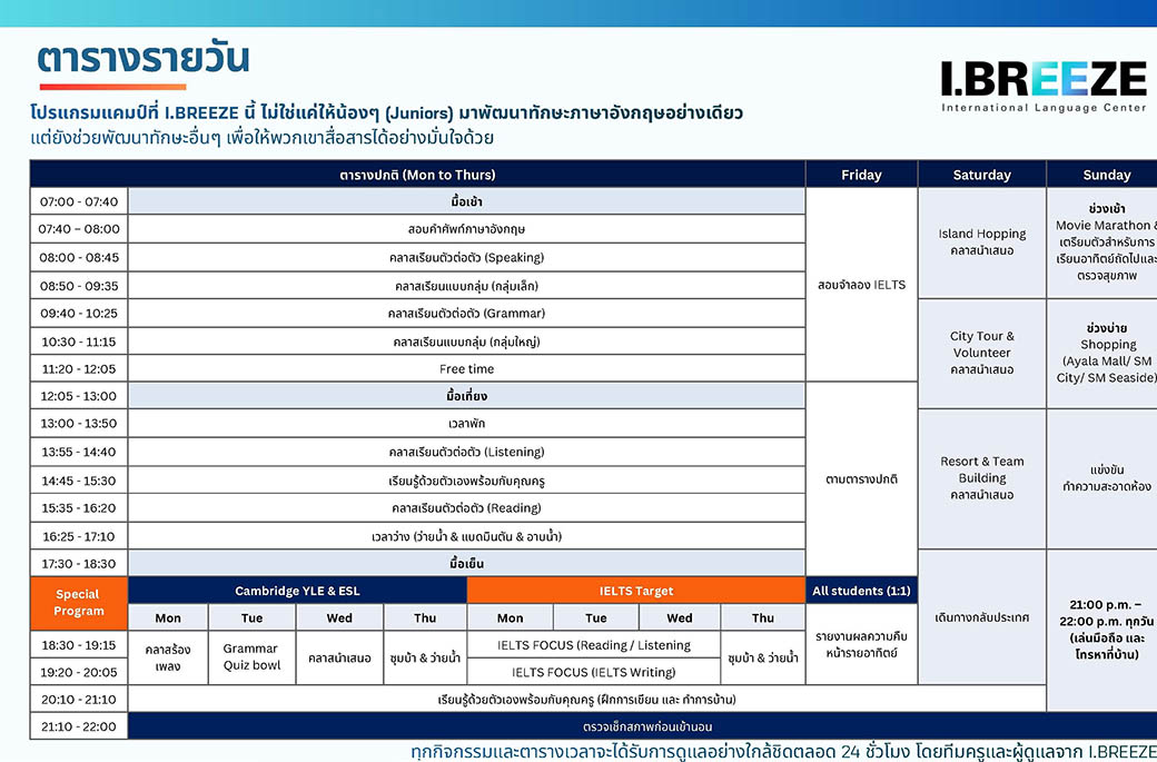 • นักเรียนจะได้อยู่ในสภาพแวดล้อมที่ต้องใช้ภาษาอังกฤษ 24 ช.ม. ที่สถาบัน I.Breeze