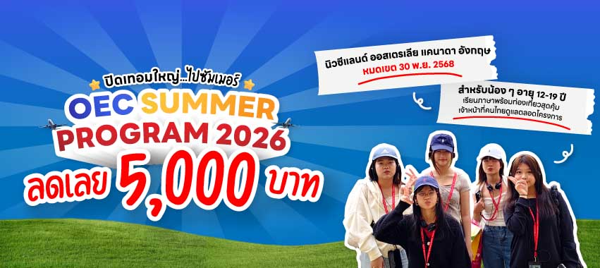 ปิดเทอมใหญ่ 2569 ไปเรียนซัมเมอร์ต่างประเทศกับ OEC สำหรับน้องๆ อายุ 12-19 ปี อุ่นใจหายห่วง! พี่กรุ๊ปลีดเดอร์คนไทย สำหรับผู้ปกครองที่อยากส่งลูกไปเรียนซัมเมอร์ต่างประเทศ พลาดไม่ได้กับโปรแกรมสุดคุ้ม เรียนในโรงเรียนมัธยมร่วมกับนักเรียนต่างชาติ มีโปรแกรมบัดดี้ที่จะช่วยให้น้อง ๆ ได้พัฒนาทักษะการสื่อสารให้ก้าวกระโดดกว่าเดิม และพิเศษสุด ๆ ทัศนศึกษาในสถานที่ท่องเที่ยวยอดฮิตมากมาย พร้อมแล้วหรือยังที่จะเดินทางไปสัมผัสประสบการณ์สุดประทับใจ อย่ารอช้ามาเข้าร่วมเป็นส่วนหนึ่งในโครงการ OEC Summer Program Course 2026
