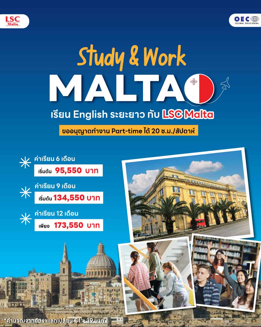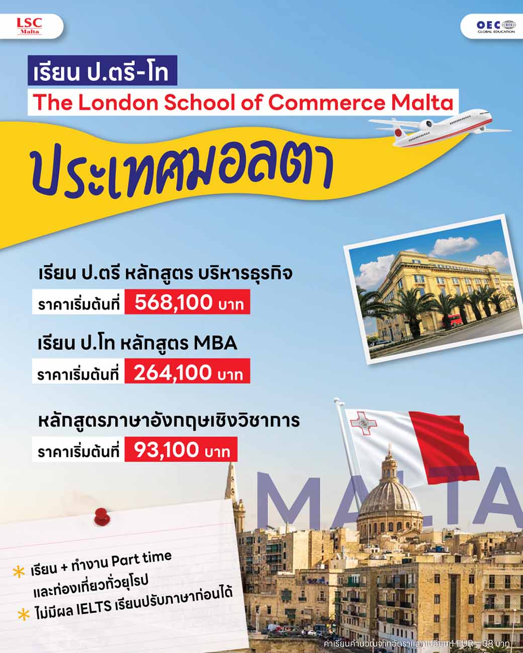 เรียน ป.โท ที่ The London School of Commerce Malta ประเทศมอลตาหลักสูตร 1 ปีจบ สามารถทำงาน Part time และท่องเที่ยวทั่วยุโรป ไม่มีผล IELTS เรียนปรับภาษาก่อนได้ |